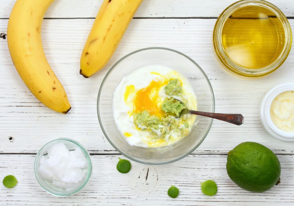 Banana, avocado, lime, yogurt, shea butter, egg yolk, coconut and olive oil for hair mask, flat lay.