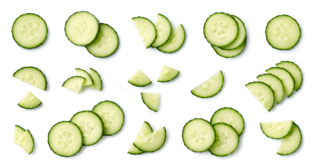 Set or collection of various fresh cucumber slices isolated on white background. Top view