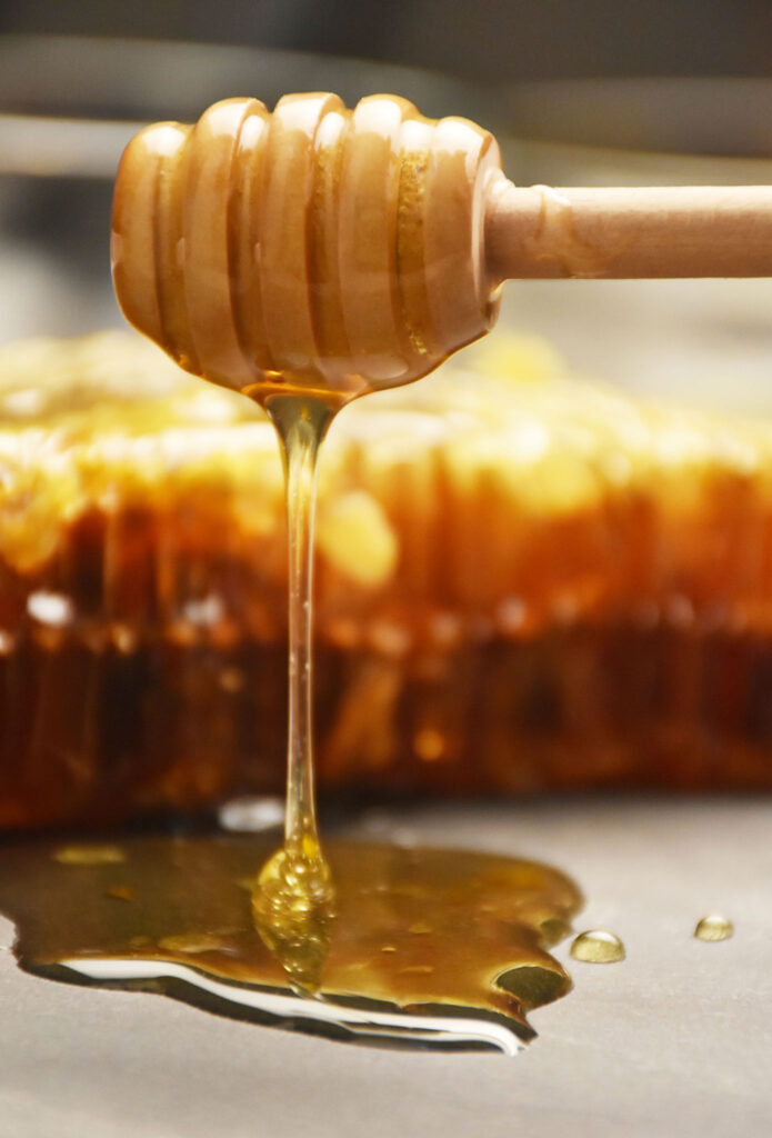 Honey, honey dripping from honey dipper and honeycomb honey