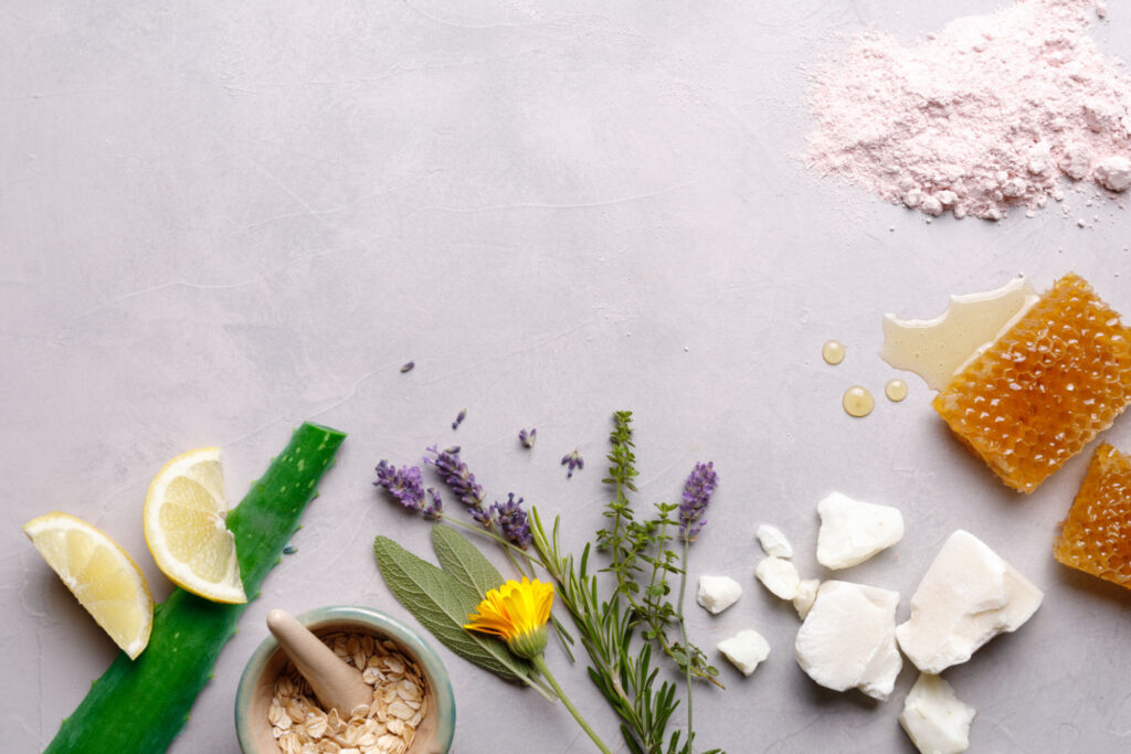 Different natural cosmetic ingredients with copy space