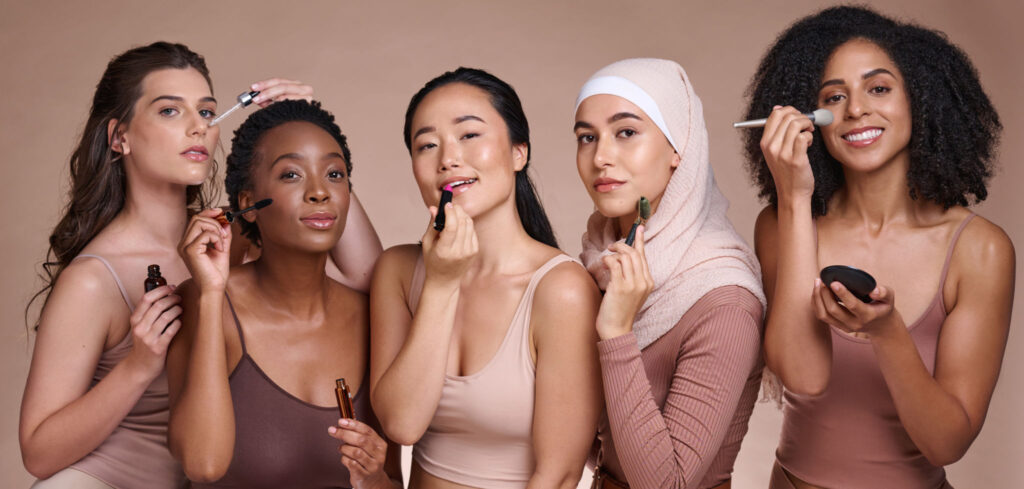 Beauty, diversity and cosmetics with makeup and women in portrait for cosmetic product advertising, skincare and different. Skin, face and facial treatment with self care and marketing with wellness.